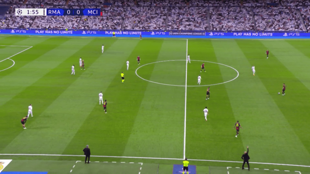 L’organisation offensive de City face au Real : Ici une défense à Akanji – Dias – Walker, devant eux Rodri – Stones, plus haut Gundogan de Bruyne. Grealish Bernardo au large et Haaland devant. Un schéma modulable en fonction de plusieurs critères.