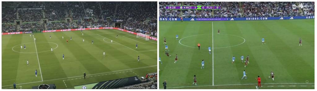 Le contraste et net entre l’occupation symétrique et rationnelle du terrain par le Chelsea de Maresca (ici en finale de C4), et la disposition bien plus libre du Flu de Diniz (ici en finale du Mondial 2024 face à City)