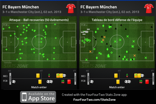 Le Bayern défend en avançant avec une grande efficacité et gagne tous les duels. Pour City, le jeu direct est alors la seule option envisageable. Mais même dans ce cas-là, la ligne défensive du Bayern remonte militairement et élimine Aguero et/ou Dzeko. Là aussi, la compacité et la hauteur du bloc Bavarois condamnent les espoirs des hommes de Pellegrini.