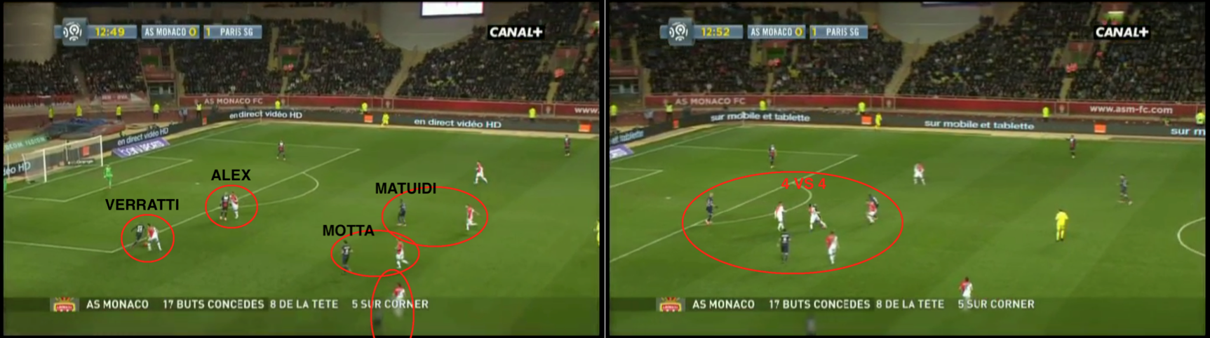 Les monégasques pressent haut après l’ouverture du score, et font largement le nombre avec la relance parisienne. Mis sous pression et privé de solution, Verratti cède au pressing d’Ocampos et Paris vacille. Motta avait essayé de sortir sur VdW juste avant cette séquence, mais avait du battre en retraite face au pressing.