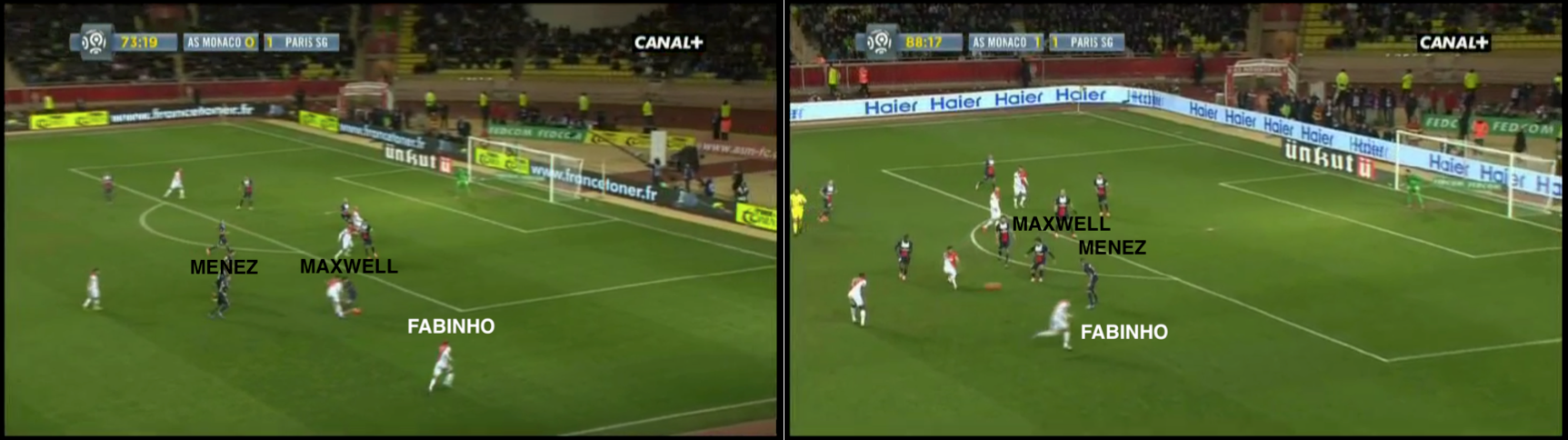 Le but Monégasque est marqué sur attaque placée, dans des conditions relativement inquiétantes : La coopération Menez – Maxwell est désastreuse sur l’action qui amène le centre fatal de Fabinho. Maxwell sort, alors que son partenaire défend intérieur, laissant le champ libre à l’ancien Madrilène pour centrer. Même chose sur l’énorme occasion de la 88e avec un décalage créé dans des circonstances similaires. Si ce n’est que cette fois-ci, les deux défendent intérieur…
