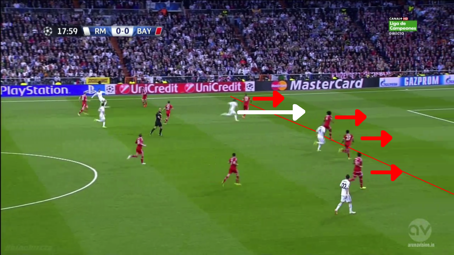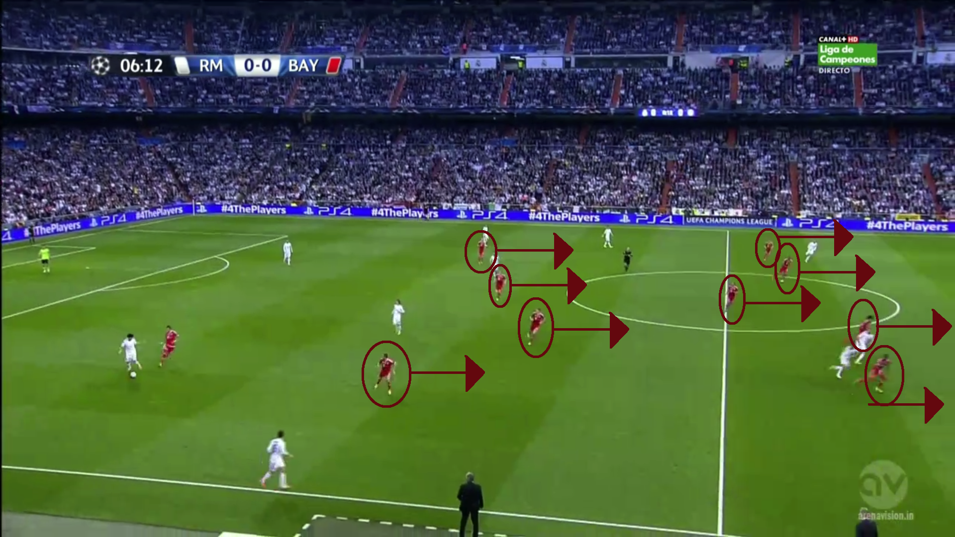 La présence du seul Mandzukic au pressing a eu plusieurs conséquences néfastes pour le Bayern, notamment la possibilité pour Madrid de procéder à de véritables attaques placées sur la largeur. Le Bayern devra presser plus haut, plus dur et plus en nombre pour priver le Real de ces respirations nécessaires à sa survie. D’autant plus à l’extérieur, et dans un contexte où la qualification peut changer de camp en un but.