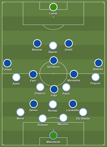 Les premières minutes sont très positives pour Lyon. Le ballon est marseillais mais le 4312 de Rémi Garde (433 sans le ballon) perturbe beaucoup la relance. Dès la 3e minute, une interception haute de Gomis provoque la première occasion de la partie. Sur cette séquence, l’OM aurait pu payer à la fois son obstination à jouer court et l’indiscipline de son repli, l’absence d’Ayew étant exploitée par Gonalons pour trouver appui sur Gomis, ce qui permet à Lacazette de partir dans le dos de Diawara. Même si Gomis était hors-jeu, ce premier accroc défensif aurait pu couter un penalty (voire pire) à l’OM.