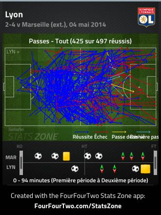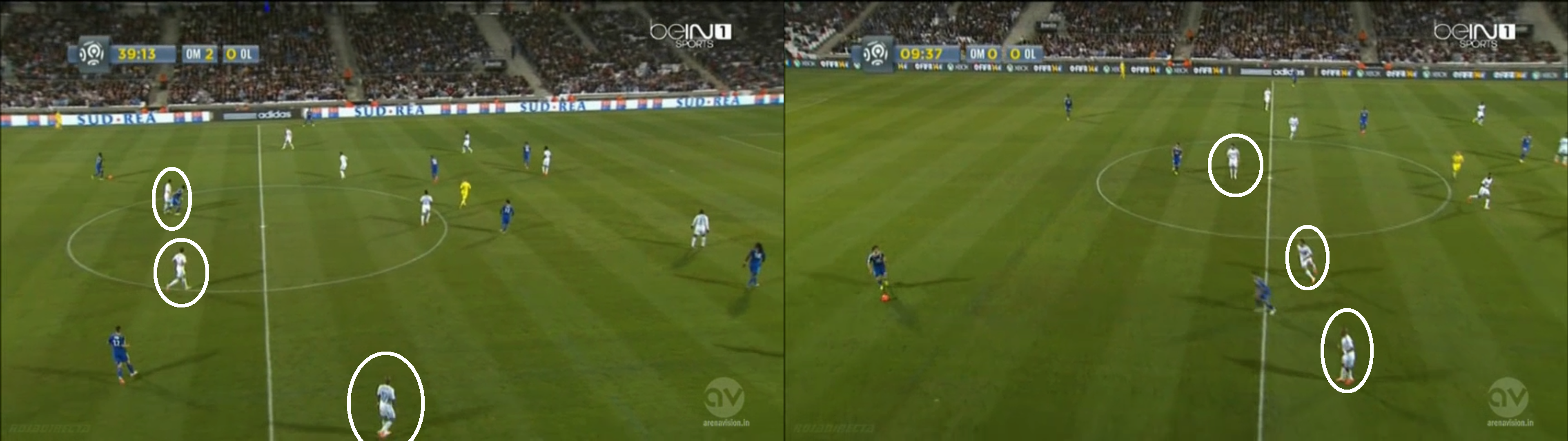 Il ne serait pas vraiment juste de considérer que les Lyonnais ont juste rendu une mauvaise copie sur le plan technique, et qu’ils ont juste été maladroits dans l’utilisation du ballon. Les absences combinées de Gourcuff et Grenier vont dans ce sens, mais avec Mvuemba, Gonalons et Ferri, on ne peut pas dire que Garde ait aligné un trivote de Vikings incapable d’aligner deux passes. C’est la supériorité numériques créée par cet OM discipliné derrière le ballon qui a fait déjouer le cœur du jeu lyonnais, et c’est la compacité de l’OM qui a empêché les appuis, ou forcé les Lyonnais à les chercher dans des conditions impossibles techniquement pour leurs 3 joueurs offensifs (Fekir, Lacazette et Gomis).