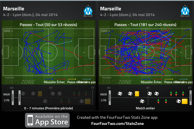 Entame en trompe-l’œil, avec l’OM dans le rôle du possesseur stérile. Ce schéma ne va pas durer longtemps : sur les 181 passes que les Marseillais vont produire dans le match, 50 sont effectuées dans les 7 premières minutes.
