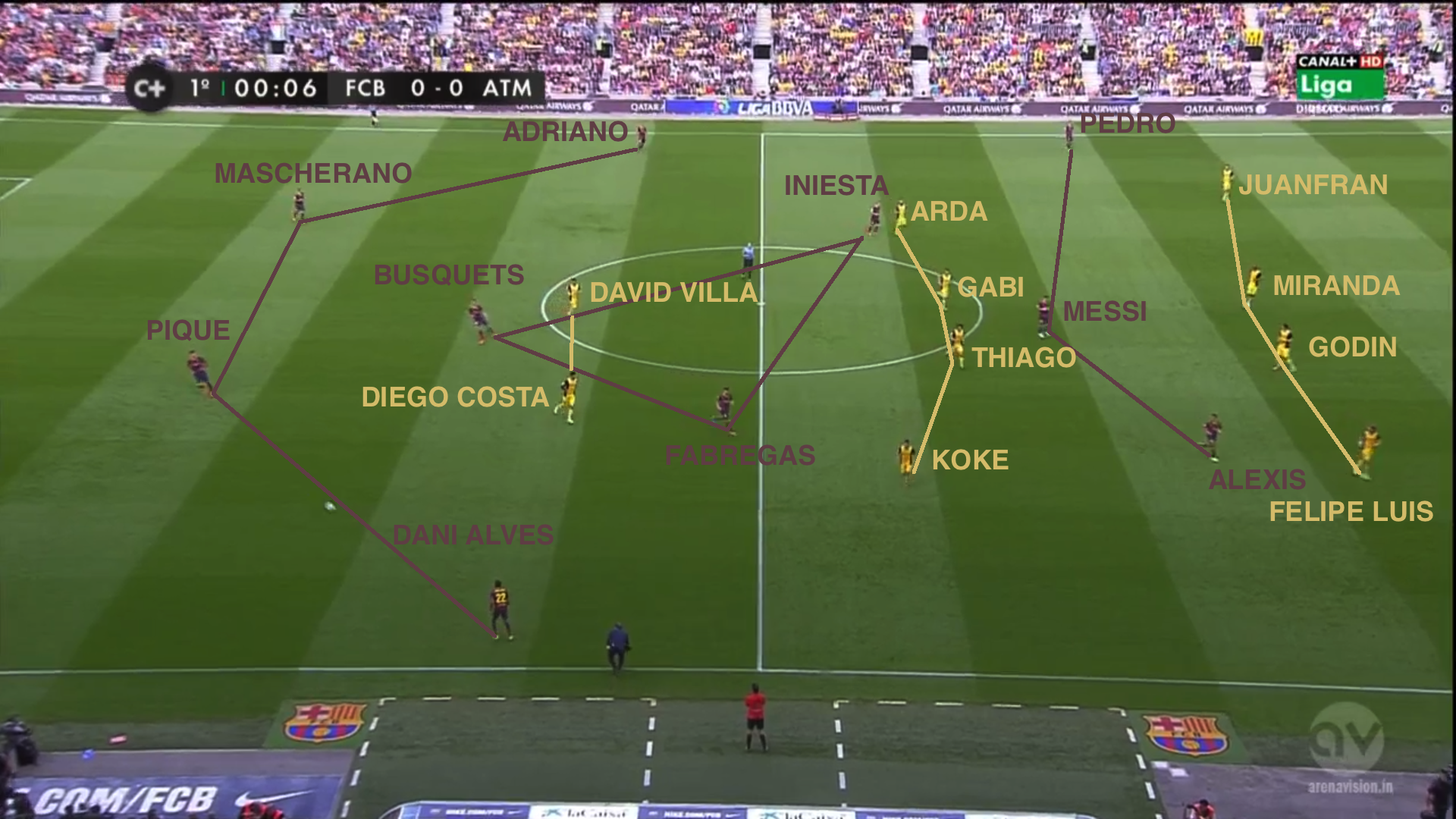 Affrontement classique entre le 433 de Tata Martino et le 442 de Diego Simeone. Seules les présences de Fabregas pour Xavi et Adriano au poste d’arrière gauche sont à noter. Les blessures de Costa et Turan vont vite pousser Cholo à modifier ses plans.