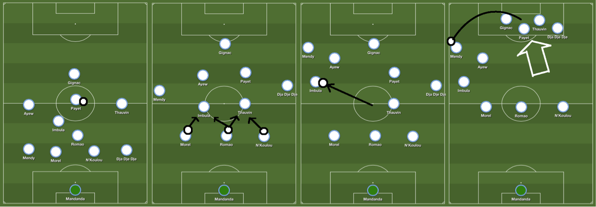 Pendant ce temps, Mendy et Dja Dje Dje ont déjà investi les postes d’Ayew et Thauvin, transformant le 4231 en un 343 dont ils sont désormais les ailiers. Le décrochage de Thauvin peut d’ailleurs faire office de fausse piste, visant à attirer un milieu pour mieux chercher la profondeur, comme ce fut le cas sur l’ouverture du score de Gignac à Evian.
