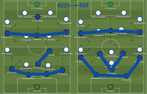 Once the pressing was contested through the width of fullbacks and backward movement of the midfielders, Club Bruges move back to 4231 system, in order to be effective in the last third.