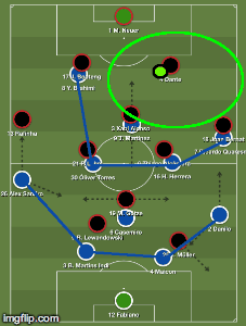 Au milieu de terrain, le pressing était maximal, et ces couvertures se devaient d’être parfaitement assurées. La relative liberté laissée au central qui avait le ballon, n’était qu’un leurre : grâce à un jaillissement bien senti de Quaresma, Dante commet l’erreur fatale et Porto mène 2-0 après 9 minutes de jeu.