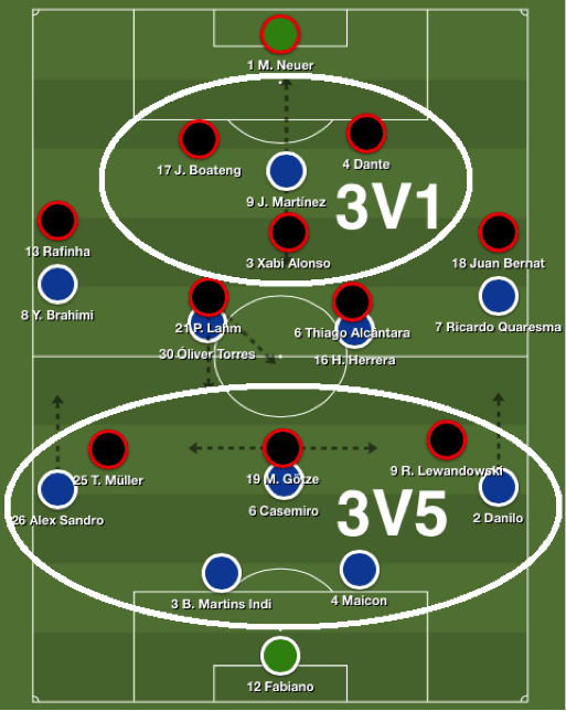 - Sur les côtés : les paire [Bernat – Götze] et [Rafinha – Lahm] ont traqués les ailiers et les latéraux de Porto sur tout le terrain.