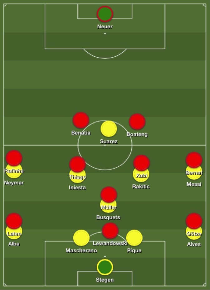 - Ensuite – si le Bayern s’en sortait – un 442 à plat se mettait en place. Neymar se joignait à Iniesta, Busquets et Rakitic derrière Suarez et Messi.