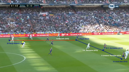 Sur l’occasion de Benzema à la 34e, les Blancs créent une situation de 2 contre 2 après que Ronaldo se soit échappé dans le dos d’Alba, après une perte de balle de Messi dans l’axe. Mais là encore, Pique et Vermaelen sont à 2 contre 1 pour gérer Benzema, avec un excellent retour du Catalan.