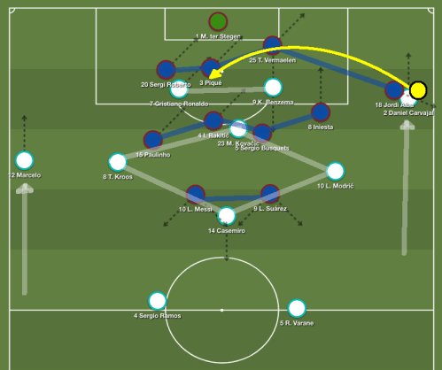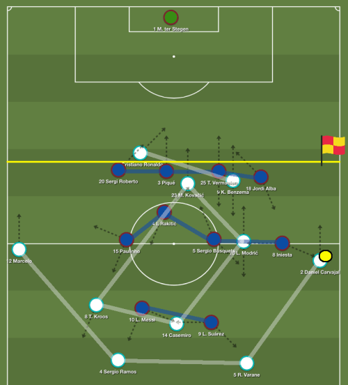 Partout sur le terrain, les Madrilènes chargeaient les Catalans en 1 contre 1. Le Real se trouvait ainsi quasiment à 3 contre 3 derrière avec Paulinho – Suarez – Messi face au trident Ramos – Varane – Casemiro. Rapidement, le gardien du Barça Ter Stegen fut le seul homme libre sur la sortie de balle, et le jeu long sa seule option, dans une configuration qui rappelait celle du Barça – Bayern de 2015.