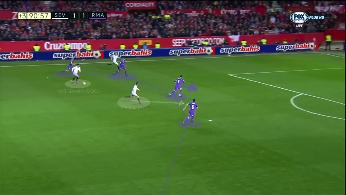Le porteur (Jovetic) profite de la sortie de Ramos de l’axe ballon-but pour allumer Navas.