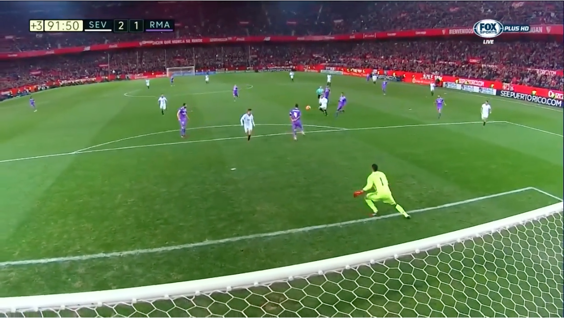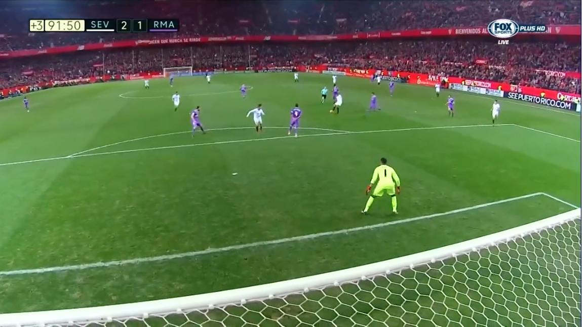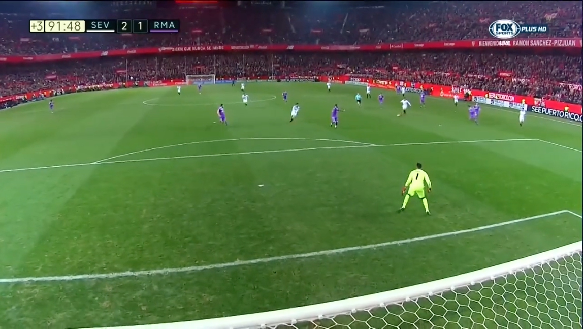 Sur cette séquence, on remarque que le centre au cordeau « passe », alors que Ramos mise sur son corps pour couper le centre en retrait.