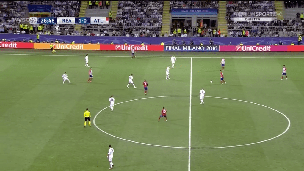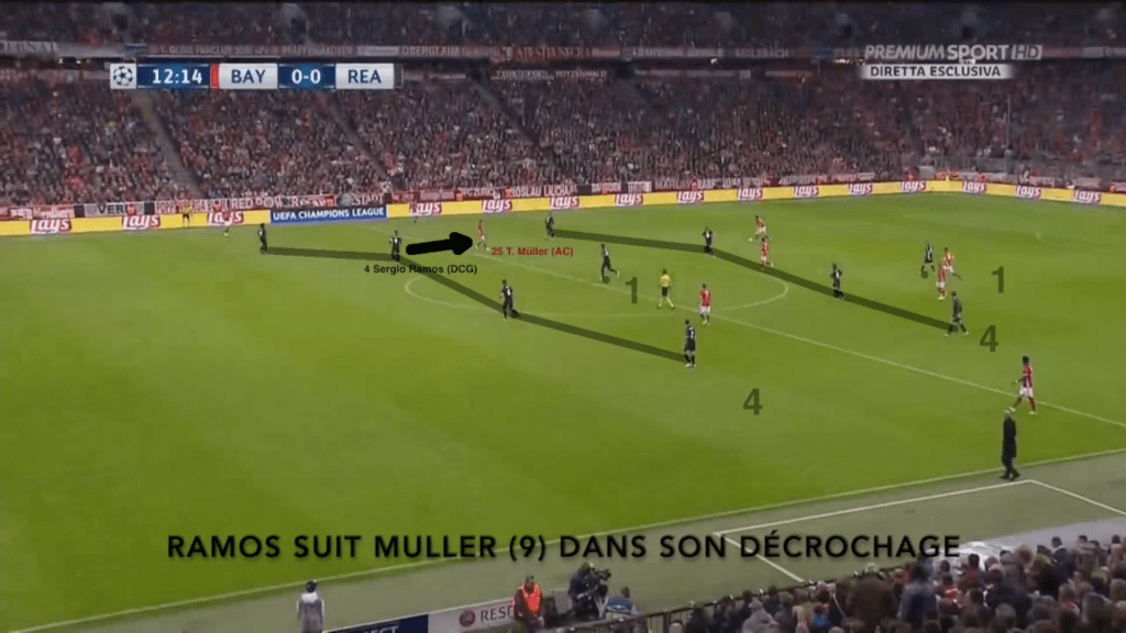 Le contraste avec les séquences évoquées plus haut face est clair. Aligné à droite, Ramos n’a plus la confiance nécessaire pour boucher le centre au cordeaux avec son corps. Il préfère boucher ce qui est sur son côté faible. Il sort donc de l’axe ballon-but.