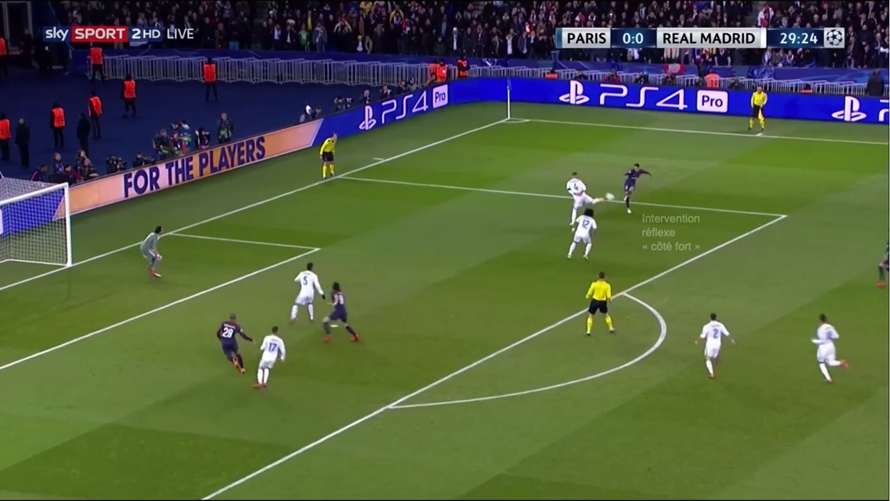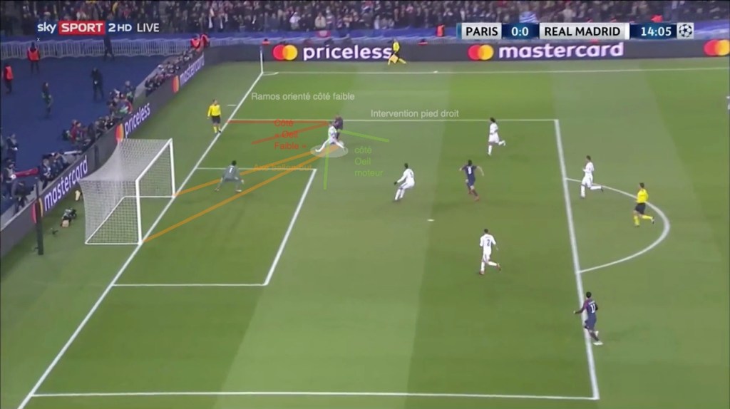 Ramos ne peut pas le laisser frapper, ni même offrir le crochet extérieur. Il ferme l’axe-ballon but, et intervient avec son pied droit : il compte sur ses réflexes côté œil directeur.