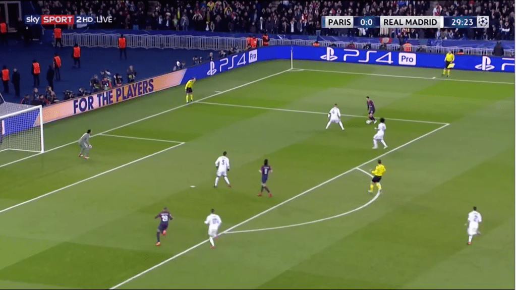 Ci-dessus, la perspective de laisser Mbappe passer l’épaule est très dangereuse. Ramos met son corps en opposition, comme face à un éventuel centre au cordeau / au 2e poteau du Français.