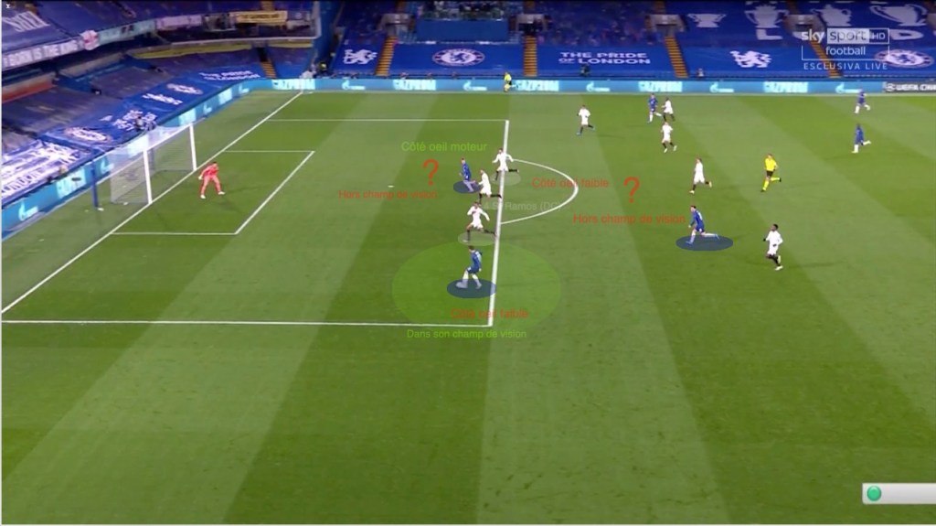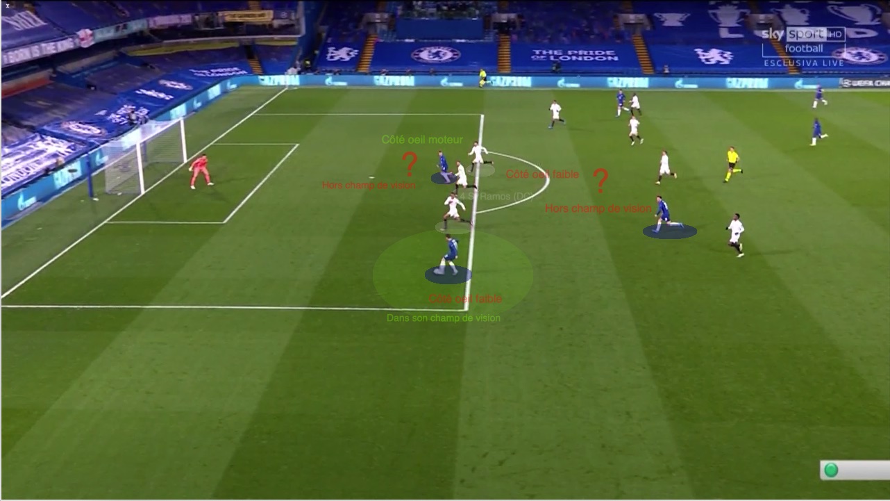 Orienté vers sa gauche, alors qu’il est tourné vers sa profondeur « à lui », Ramos n’ose pas checker furtivement son côté fort (le droit), trop anxieux de perdre l’info côté faible (chez Chillwell).