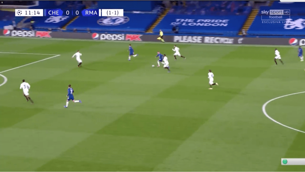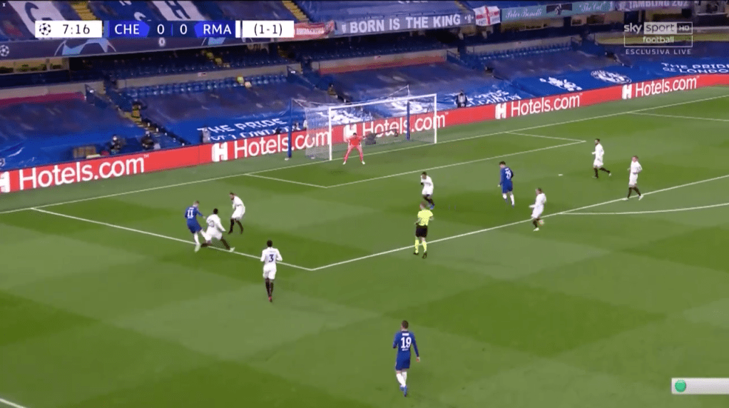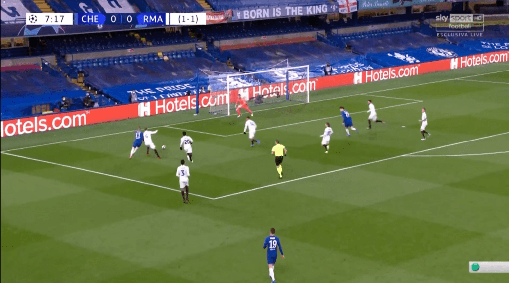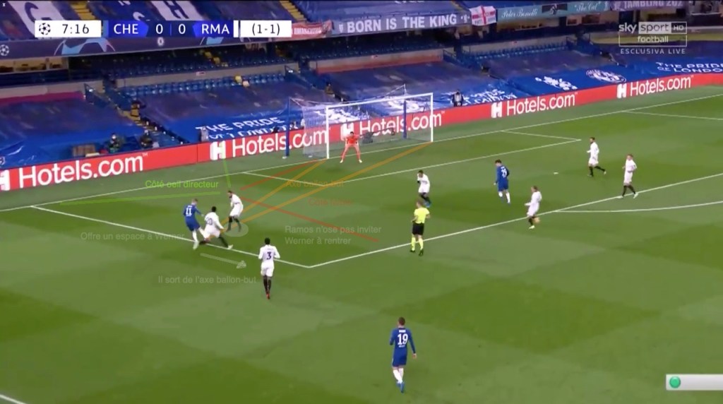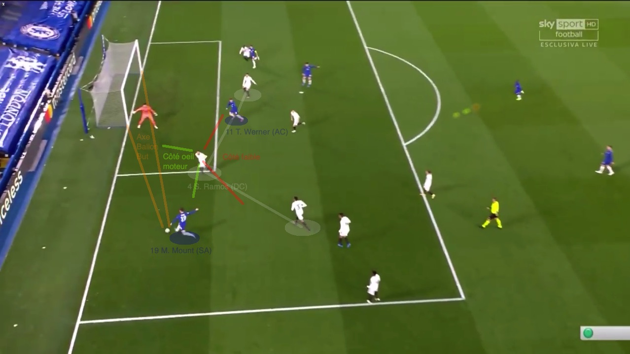 N’étant pas certain d’une éventuelle position de hors-jeu de Werner, alors que Chillwell a le champ, le temps, et la qualité pour enchainer, Ramos devrait logiquement choisir de reculer, pour couper la passe / fermer l’espace en profondeur.