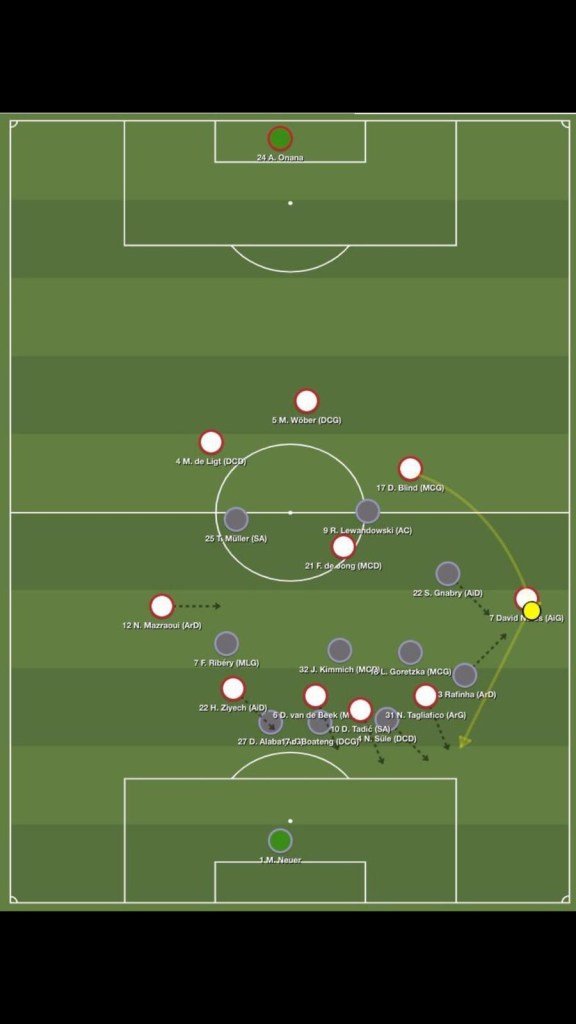 Le bloc se coupe en 2, et Tagliafico et Mazraoui vont se trouver par la force de choses relativement isolés du groupe « relanceurs » (central – central – 6 – 6), et appartiennent plus à un second ensemble de 6 joueurs, avec les 4 offensifs [Neres (AiG), Van de Beek (MC), Ziyech (AiD) et Tadic (Faux neuf)] dans une formule qu’il convient souvent d’appeler 3-1-6 ou même 2-2-6.