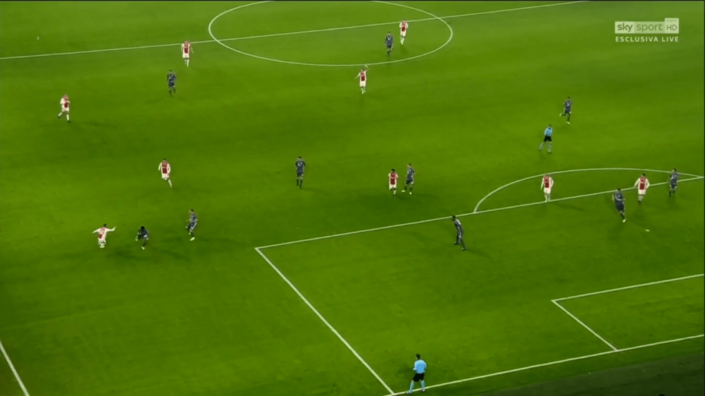 La possibilité de trouver Ziyech, ou l’un des 4 relanceurs en mesure de changer de rythme, mettait la ligne defensive adverse dans une grande hésitation au moment d’avancer : si le premier joueur lancé est mis hors-jeu par la défense, il en reste deux autres capables d’être trouvés en jeu, dans le dos de la défense, sans parler des latéraux, qui peuvent – eux aussi – être candidat à la reception d’une diagonale lobée, derrière le bloc adverse, comme on le voit plus haut avec Tagliafico.