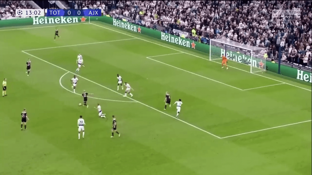 Face au 532 coulissant de Tottenham, là encore, l’Ajax s’adapte à la structure défensive adverse, à sa façon. Peut-être avec une part d’instinct. L’idee de challenger numériquement la défense s’étant deja certainement imprimée dans le subconscient des joueurs.