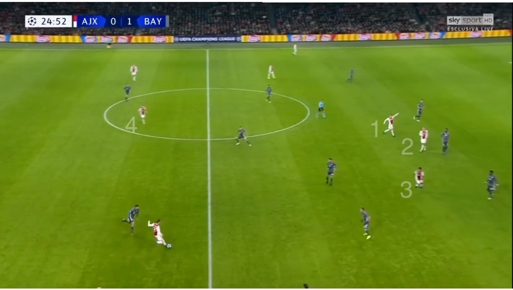 Ci dessous, alors que l’arrière gauche est servi, on voit 3 joueurs attaquer l’espace (Neres, Tadic Ziyech) alors qu’un 4e va se proposer dans les pieds (Van de Beek). D’ailleurs, rien n’empêche van de Beek et Ziyech d’intervertir au dernier moment leurs courses. Exemple typique d’application du « 4e homme ».