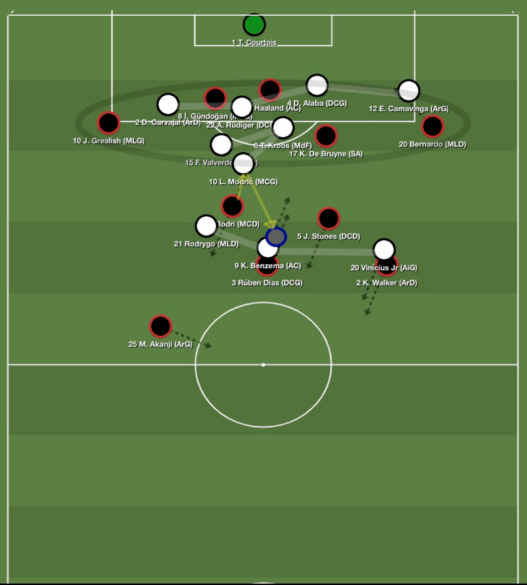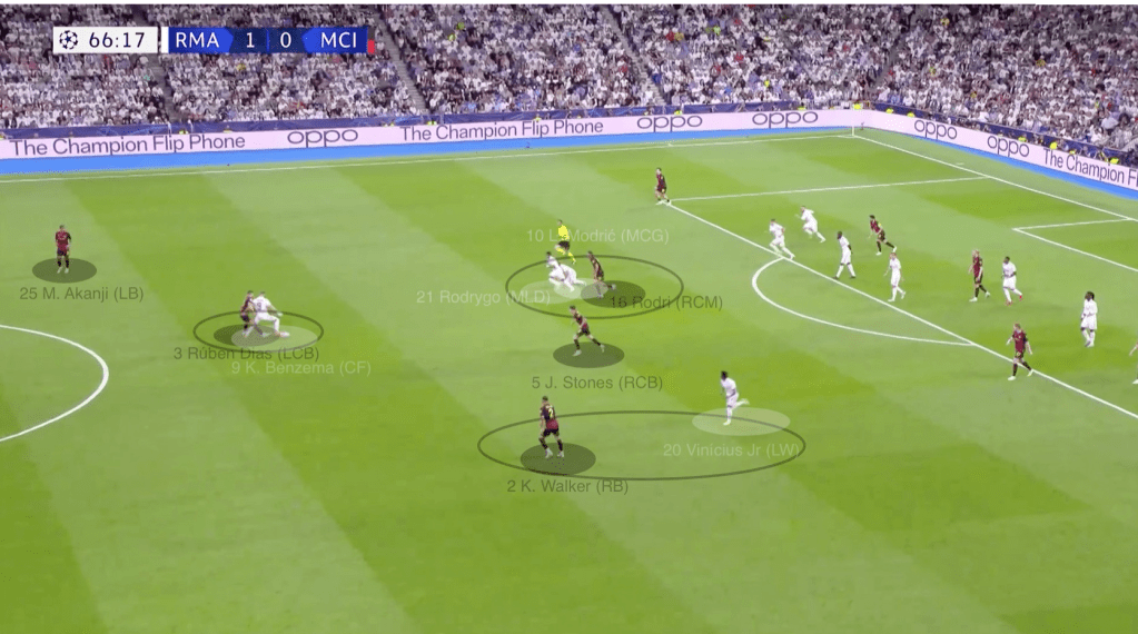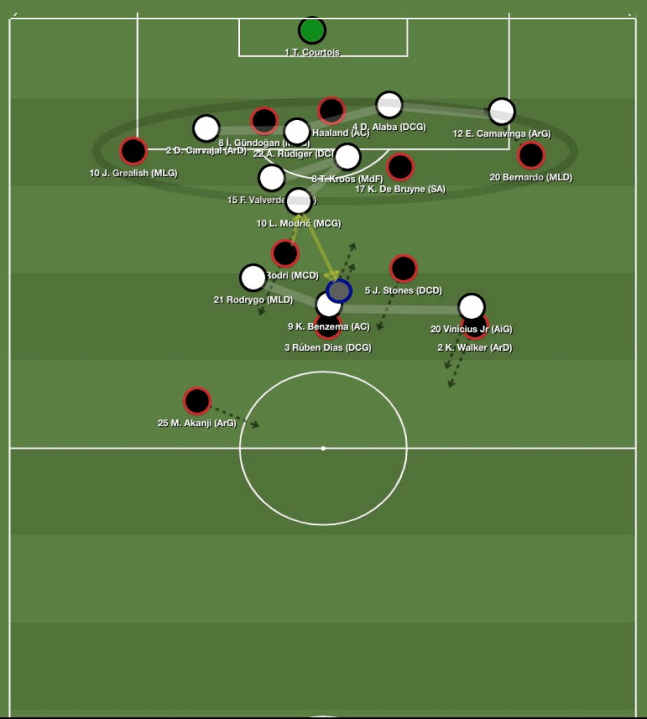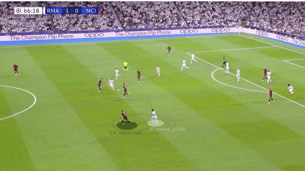 En théorie, Rodri et Stones doivent gérer Valverde et Modric à la perte de balle. On voit que Walker est très attentif à Vinicius JR et prend sa course.