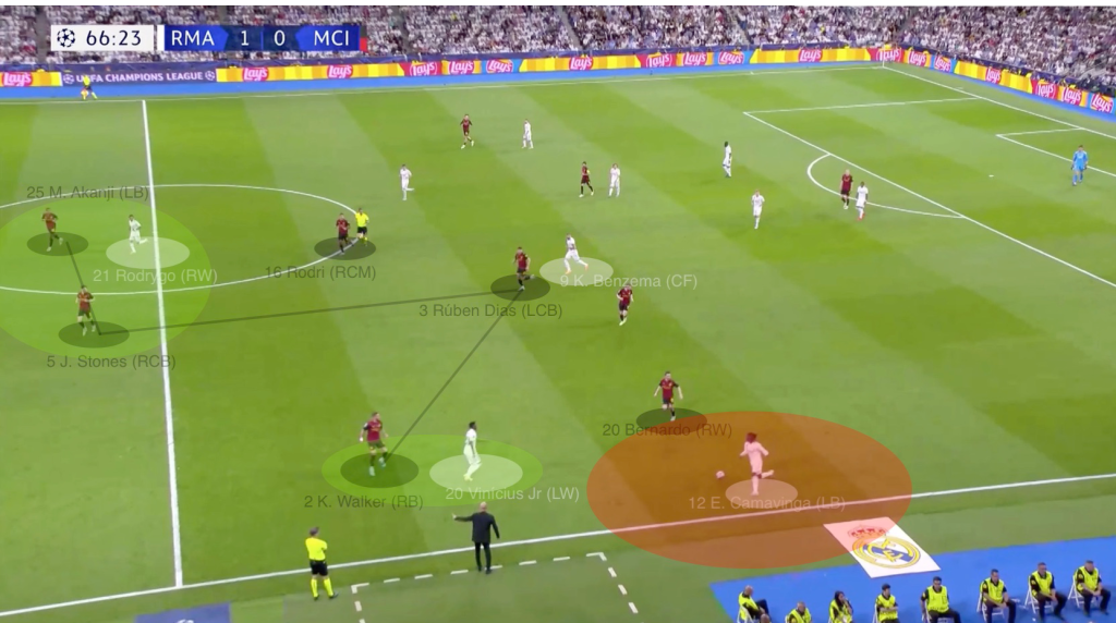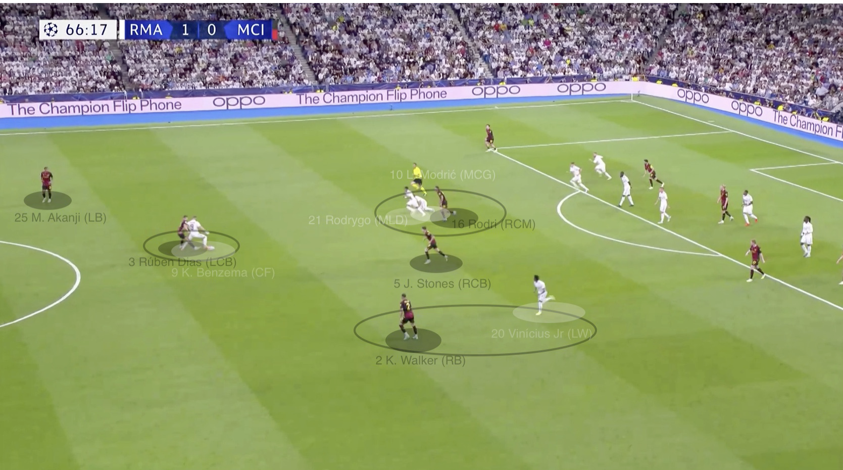 Vinicius, Rodrigo et Benzema sont eux chassés (selon où va le ballon) par Walker, Dias ou Akanji.