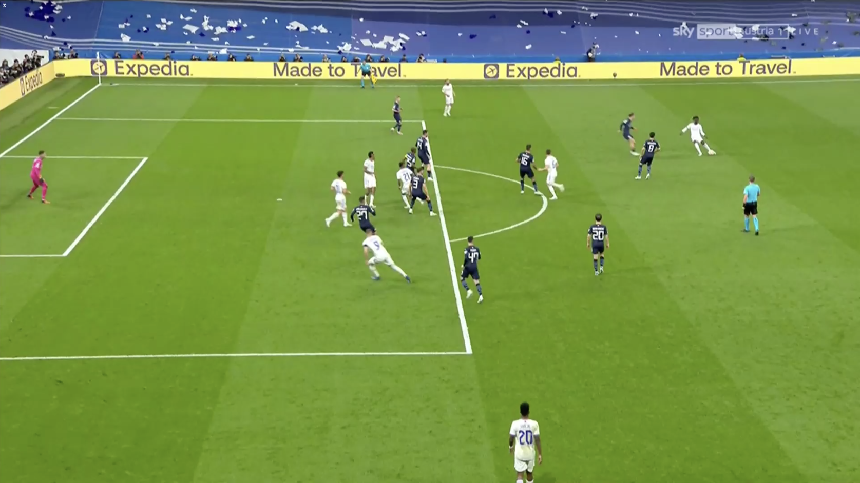 Le bloc du Real est « si bas » que City n’a pas vraiment besoin de supériorité numérique. Par contre, avec Kroos, Valverde et Modric, le Real a deux artilleurs de choix pour lancer ses contres, et un ailier gauche dévastateur. L’objectif est d’empêcher toute prise de vitesse ballon au pied.