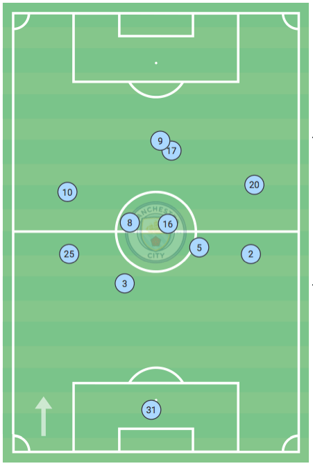 Selon l’organisation de l’adversaire, City s’organise pour être béton sans le ballon, et au moment de le perdre.