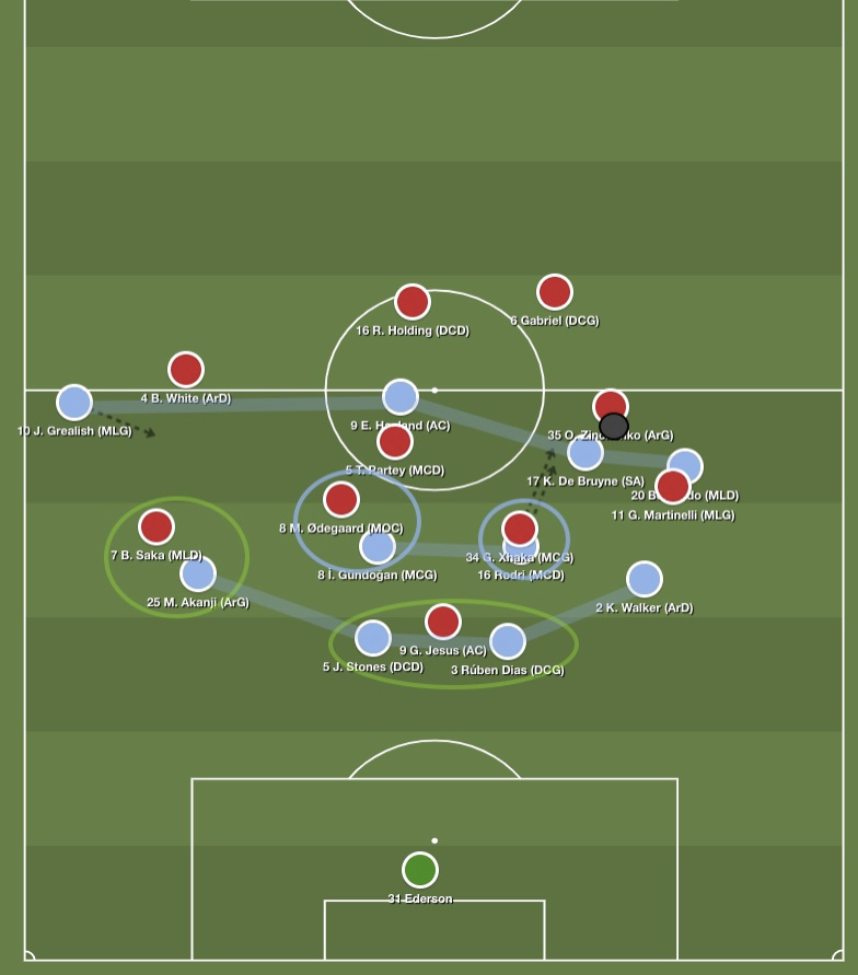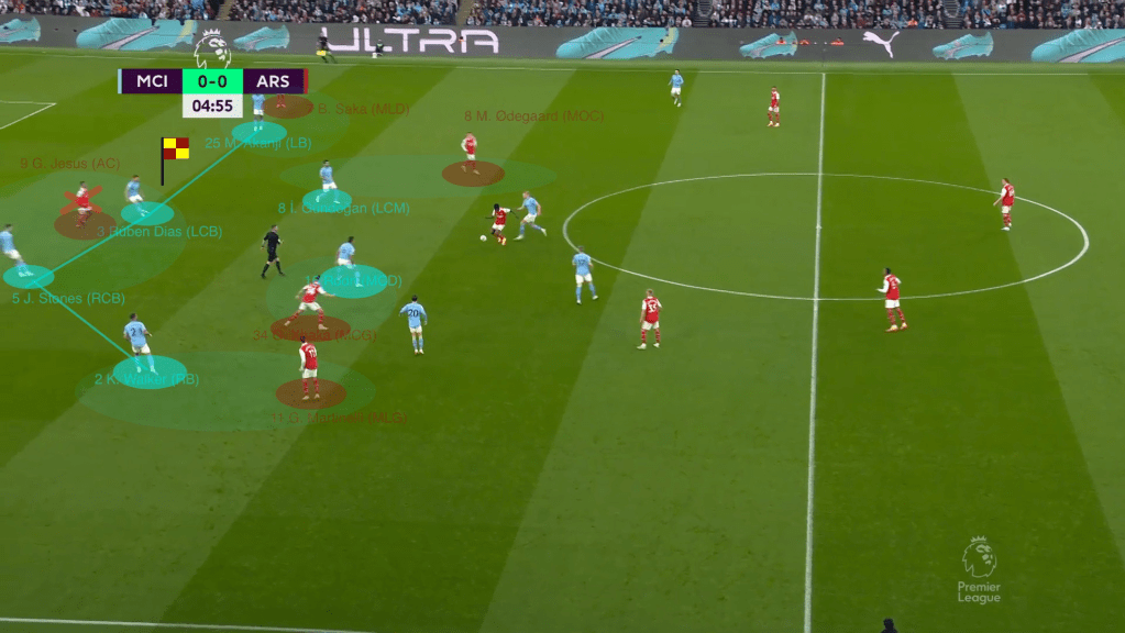 Par la suite, City bascule sur son ambitieux plan de jeu défensif en 442 : Ruben Dias et Stones se permettent de mettre Jesus hors-jeu, et Martinelli et Saka ont de sérieux clients en la personne de Walker et Akanji.
