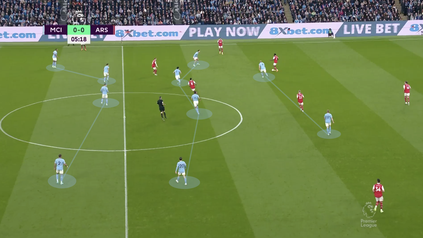 Pas de Stones au milieu ici, on sort le ballon en 4+2, dans l’espoir de fixer tous les milieux et les attaquants d’Arteta, avant de trouver la passe fatale pour jouer un 4 contre 4, voire un 2v2 entrée Haaland – De Bruyne et la paire de centraux.