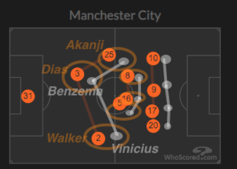 Positions moyennes de City face au Real (aller) Walker (2) et Akanji (25) aux postes de latéraux droit et gauche